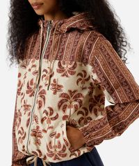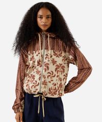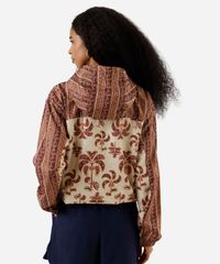 Jaqueta corta vento feminina confeccionada em tecido plano com mix de estampa de folhagens e étnica. A peça tem a modelagem reta, caimento solto ao corpo e recortes. O modelo tem capuz fixo forrado, fechamento por zíper, cordão embutido para ajuste na barra e mangas longas com elástico nos punhos. Possui dois bolsos funcionais.