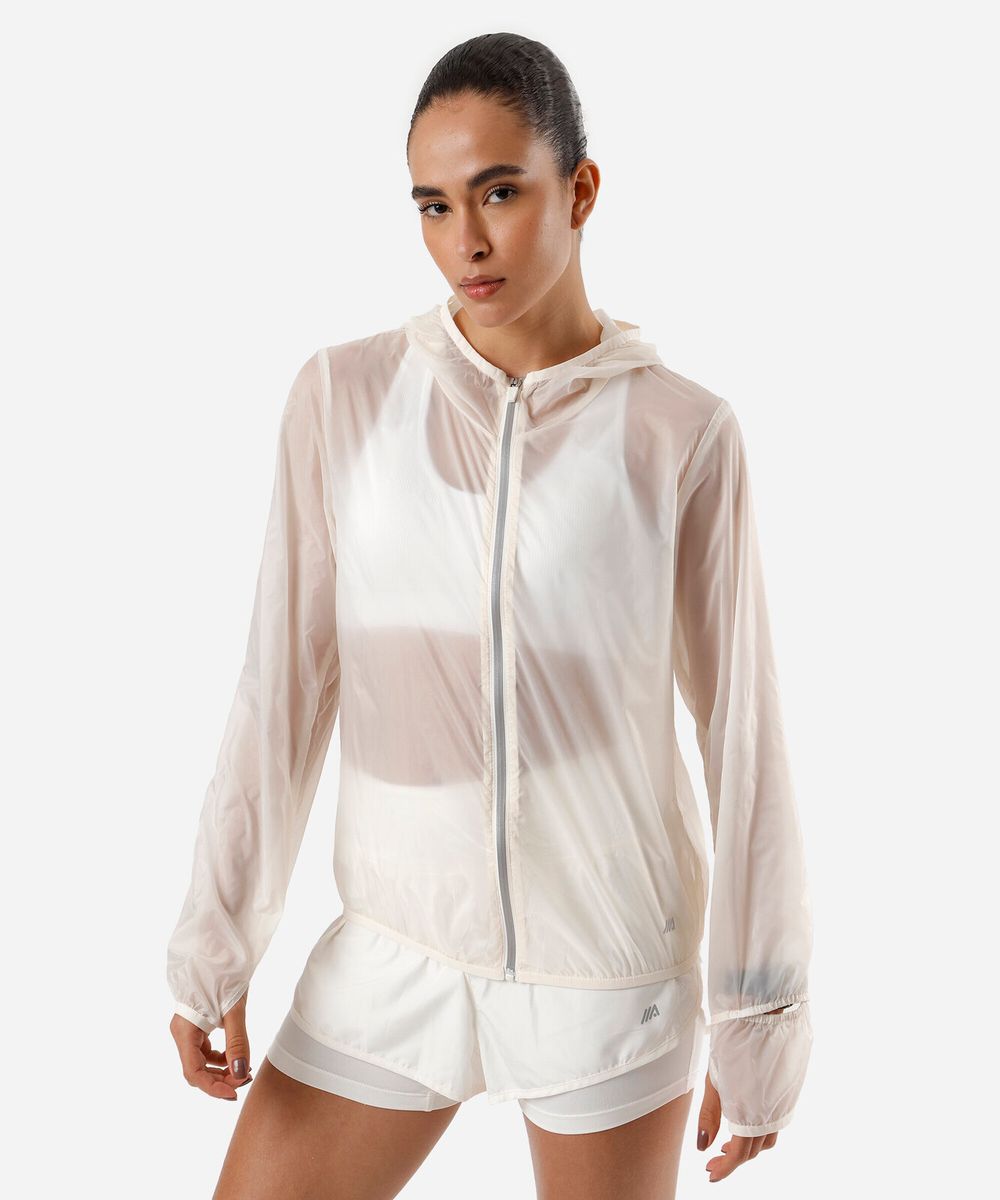 Jaqueta feminina confeccionada em tecido plano de poliamida. A peça tem a modelagem corta vento, com construção reta e o caimento solto ao corpo. O modelo tem capuz fixo, fechamento por zíper refletivo e mangas longas com recorte nos punhos para encaixar os dedos e abertura para visualizar relógio. Possui fechamento por zíper na parte posterior. Detalhe de acabamento em viés na barra.