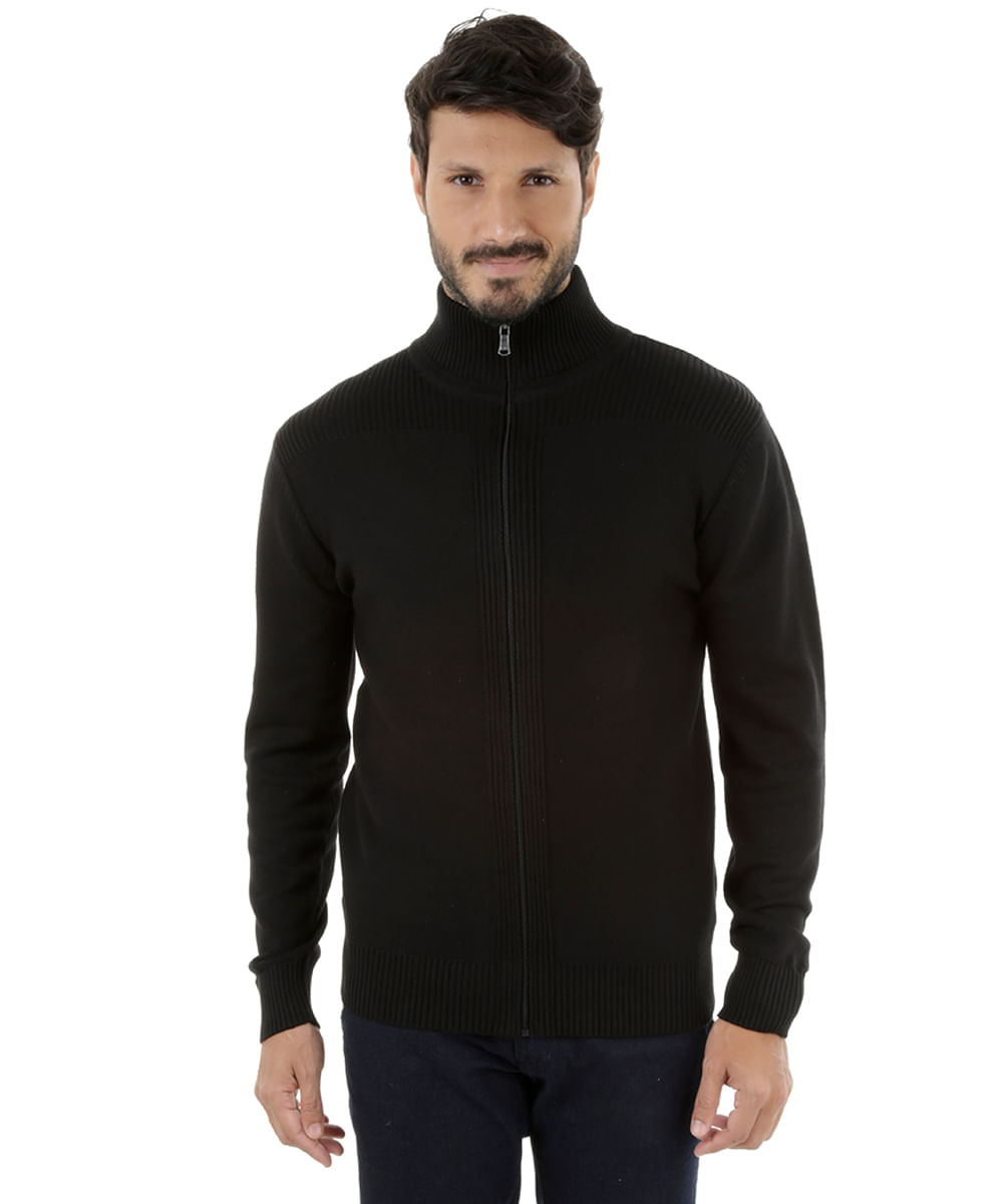 Jaqueta desenvolvida em tricô com toque macio. O modelo tem gola alta, mangas longas e fechamento frontal por zíper. Seu acabamento é em malha canelada.