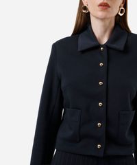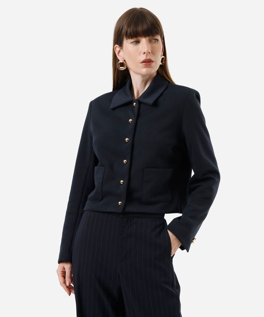 Jaqueta feminina confeccionado em malha. A peça tem a modelagem e construção reta e caimento solto ao corpo. O modelo tem gola esporte, fechamento por botões de pressão e mangas longas. Possui dois bolsos e forro.