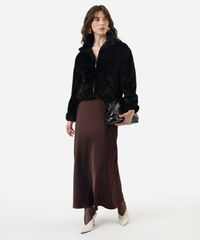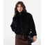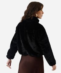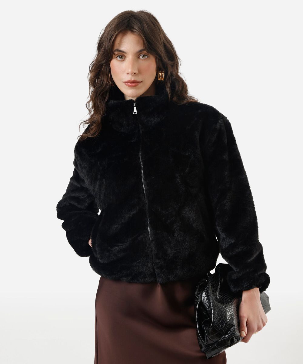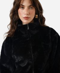 Jaqueta feminina confeccionada em pelúcia. A peça tem a modelagem e construção reta e o caimento é solto ao corpo. O modelo tem gola alta, fechamento por zíper e mangas longas com elástico nos punhos. Possui dois bolsos, forro em tecido plano e elástico embutido na barra.