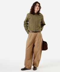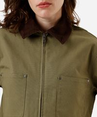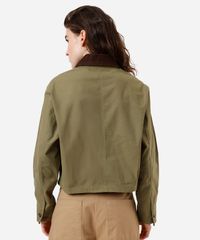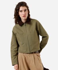 Jaqueta feminina confeccionada em sarja com elasticidade. A peça tem a modelagem e construção reta caimento é solto ao corpo. O modelo tem gola e punhos em veludo cotelê, fechamento por zíper e mangas longas. Possui dois bolsos com rebites e acabamento pespontado na barra.