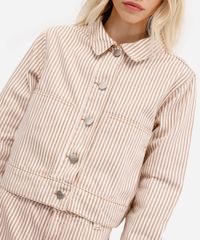 Renove seu estilo com esta jaqueta feminina listrada, uma peça versátil que combina o clássico e o contemporâneo. Confeccionada em sarja de algodão, ela oferece um toque macio e um caimento reto que garante conforto para o dia a dia. Este casaco feminino é perfeito para criar sobreposições cheias de personalidade, transitando facilmente entre diferentes ocasiões.