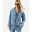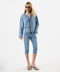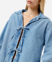 Jaqueta feminina confeccionada em jeans com lavagem clara. A peça possui gola clássica, mangas longas, caimento reto e solto ao corpo, acabamento pespontado e fechamento frontal por amarração.