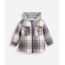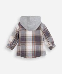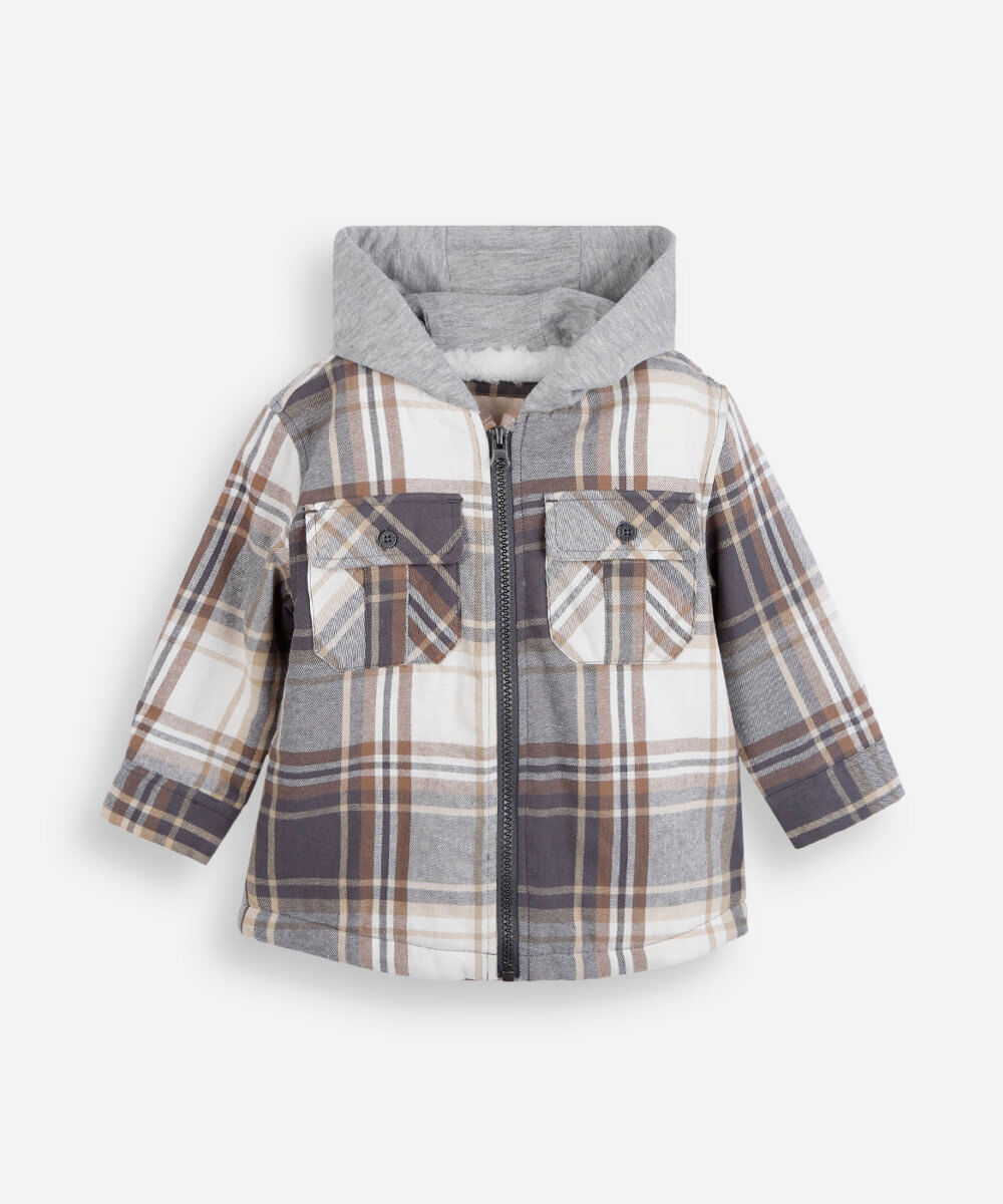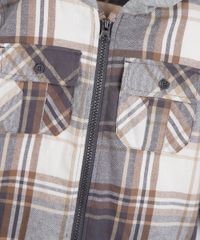 Jaqueta infantil confeccionada em tecido plano com estampa xadrez e moletom. A peça tem a modelagem e construção reta e o caimento é solto ao corpo. O modelo tem capuz fixo forrado, fechamento por zíper e mangas longas com botões nos punhos. Possui dois bolsos aplicados e forro em pelúcia.
