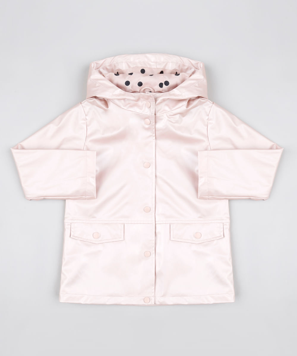 Jaqueta infantil feminina desenvolvida em material sintético com acabamento perolado. A parte frontal tem dois bolsos embutidos e fechamento por botões de pressão. Tem capuz embutido na gola. O forro é feito em tecido plano estampado de poá.
