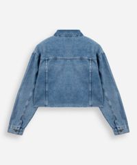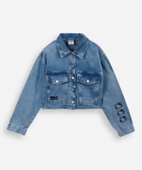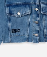 Jaqueta juvenil confeccionada em jeans com bordados temáticos da Hello Kitty. A peça tem a modelagem e construção reta e o caimento é confortavelmente solto ao corpo. O modelo tem gola esporte aplicada, fechamento frontal por botões em vista e mangas longas com botão nos punhos. Possui dois bolsos e acabamento a fio na barra.