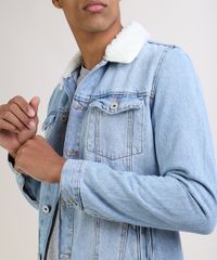 Jaqueta jeans masculina. Modelo com bolsos frontais e recortes. Modelagem trucker, ampla com caimento solto. Manga longa com punho. Fechamento com botões. Gola esporte com aplicação removível de pelo, fixada por botões.