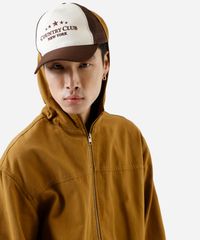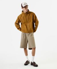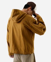 Jaqueta masculina confeccionada em sarja. A peça tem a modelagem e construção reta, recorte superior e o caimento é confortavelmente solto ao corpo. O modelo tem capuz fixo, fechamento por zíper e mangas longas. Possui dois bolsos funcionais e acabamento pespontado nos punhos e barra.
