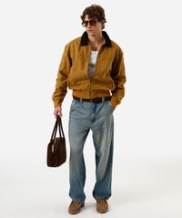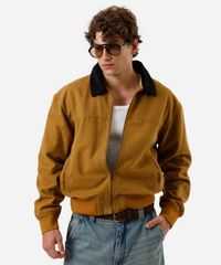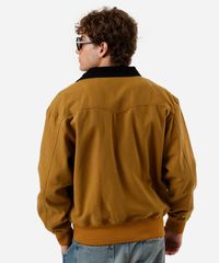 Jaqueta masculina confeccionada em sarja estonada. A peça tem a modelagem e construção reta e o caimento é confortavelmente solto ao corpo. O modelo tem gola esporte de veludo cotelê, fechamento por zíper e mangas longas. Possui dois bolsos e acabamento em malha canelada nos punhos e na barra.
