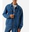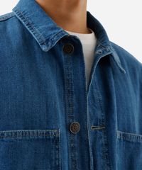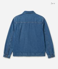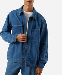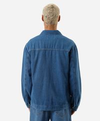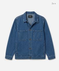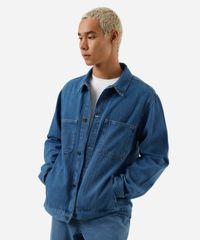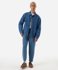 Jaqueta masculina confeccionada em jeans com padronagem listrada. A peça tem a modelagem e construção reta e o caimento é solto ao corpo. O modelo tem gola esporte aplicada, fechamento por botões e mangas longas com botão nos punhos. Possui quatro bolsos e acabamento em pesponto contrastante.
