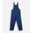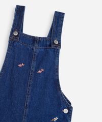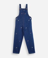 Jardineira infantil confeccionada em jeans com bordados florais. A peça tem corte afunilado e o caimento solto ao corpo. O modelo tem decote quadrado, alças finas e fechamento por botões. Detalhe de acabamento em pesponto contrastante.