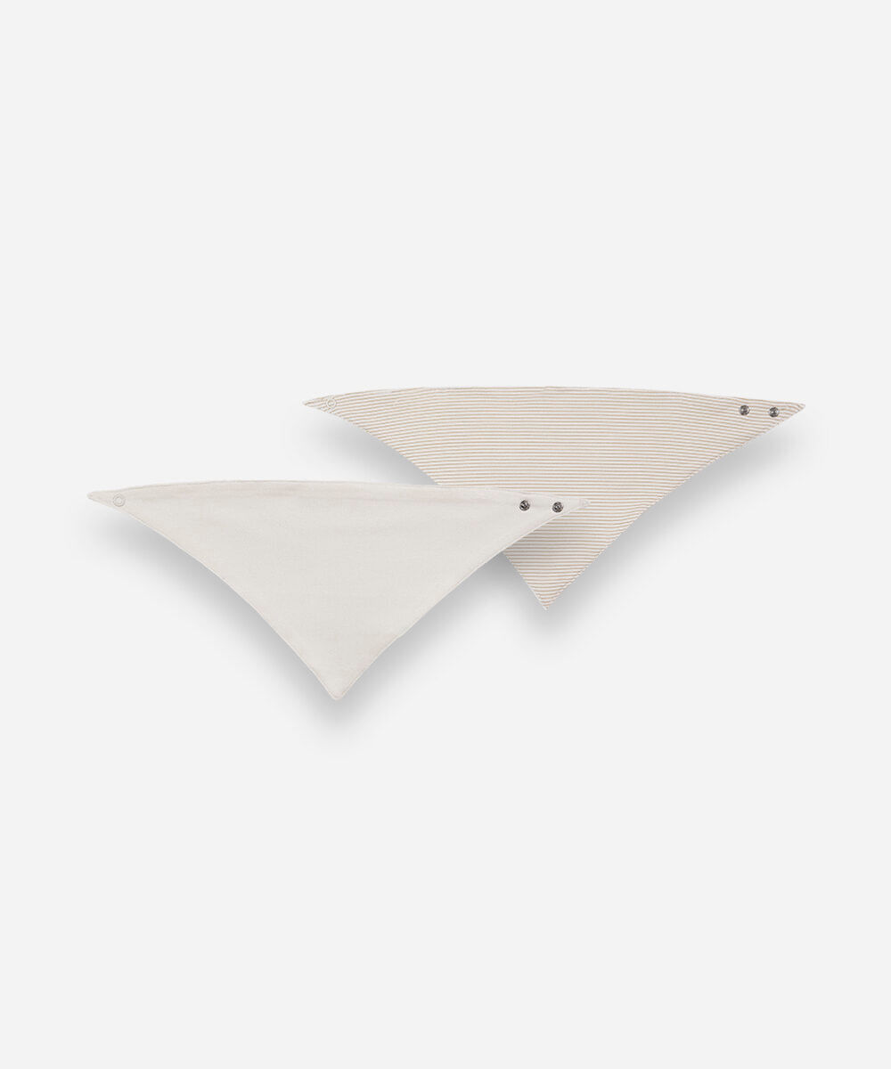 Kit infantil composto por 2 babadores confeccionados em malha macia de algodão. Os modelos tem formato de bandana, um tem estampa listrada. O fechamento é feito por botão de pressão e acabamento pespontado.