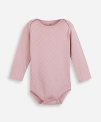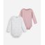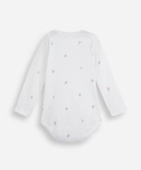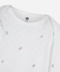 Kit de dois bodies infantis confeccionados em malha de algodão texturizada e estampa floral. As peças têm modelagem reta e caimento levemente ajustado ao corpo. Possuem gola redonda, mangas longas e fechamento por botões de pressão no entrepernas.