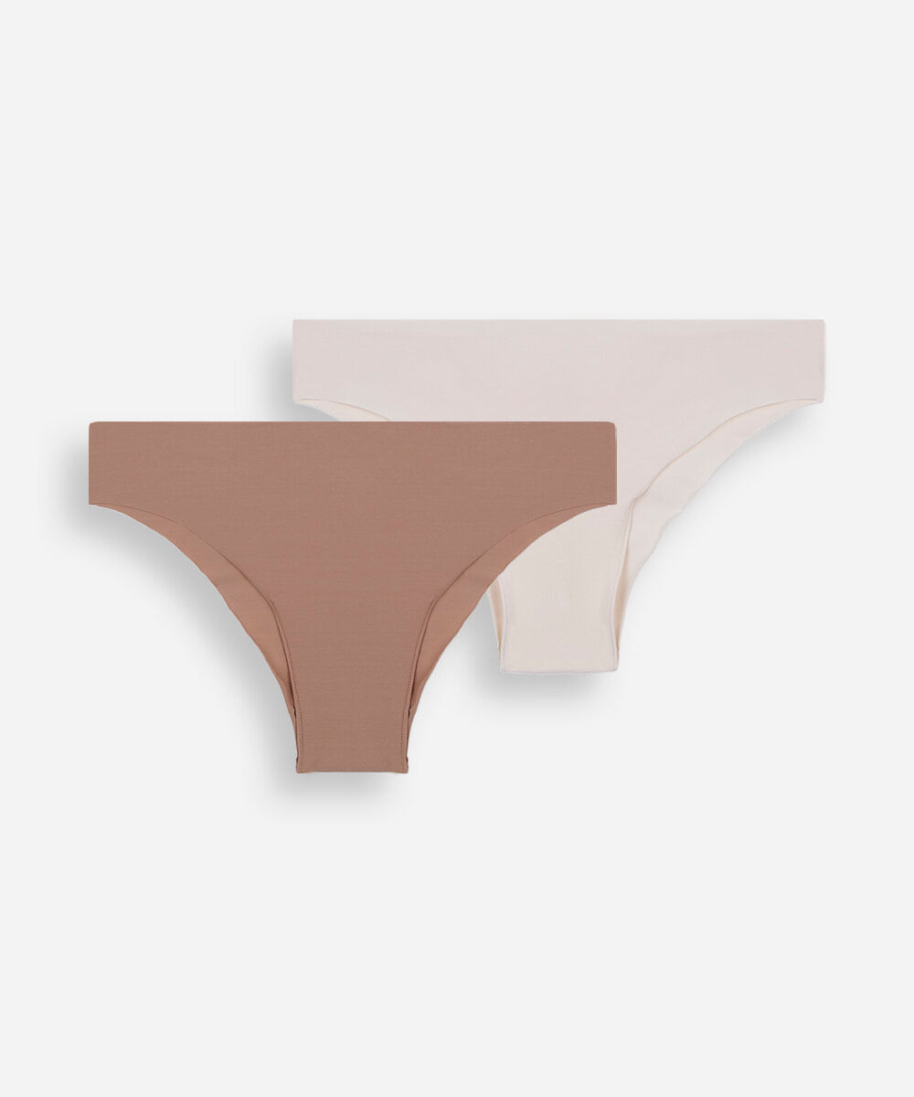 Kit de duas calcinhas feminina confeccionadas em malha de algodão. Os modelos são biquíni com caimento ajustado, laterais médias e cobertura mediana posterior. Possui forro higiênico em malha de algodão e acabamento a fio nas extremidades.