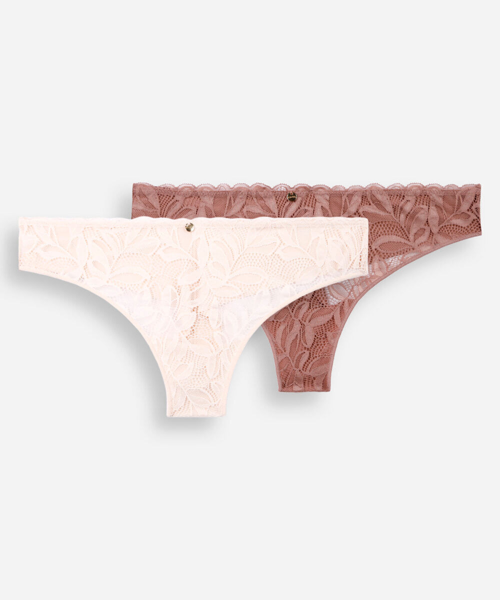 Kit de duas calcinhas confeccionadas em renda com padronagem floral. As peças possuem modelo fio dental, laterais largas, cós com elástico embutido e forro íntimo em algodão. Composição: 90% poliamida 10% elastano Modelo veste: P Medidas da modelo - Altura: 1,73m Busto: 86cm Cintura: 70cm Quadril: 101cm. Instruções de lavagem: - Lavar à mão - Proibido o alvejamento - Não secar em tambor - Secagem em varal por gotejamento - Não passar - Não lavar à seco - Limpeza à úmido processo normal