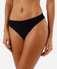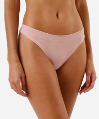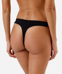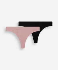 Kit de duas calcinhas feminina confeccionadas em malha canelada de poliamida. Os modelos são fio dental, com caimento ajustado, laterais médias e menor cobertura posterior. Detalhe de acabamento sem costura.