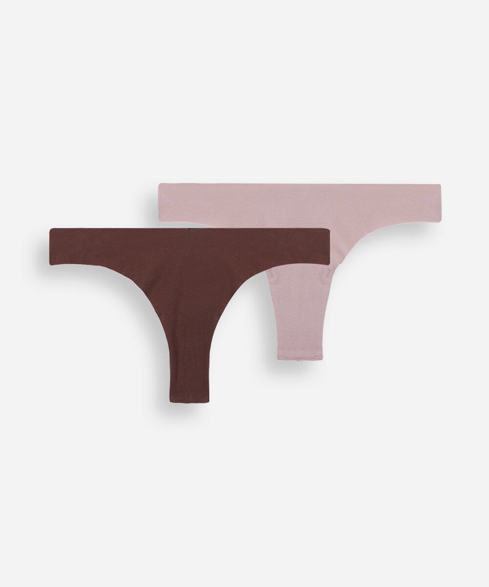 Kit de duas calcinhas feminina confeccionadas em malha de algodão. Os modelos são fio dental com caimento ajustado, laterais médias e menor cobertura posterior. Possui forro higiênico em malha de algodão e acabamento a fio nas extremidades.