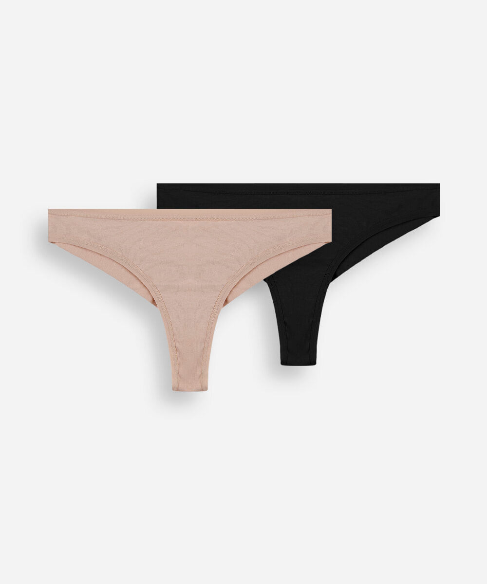 Kit de duas calcinhas femininas confeccionadas em malha de algodão. Os modelos são fio dental com caimento ajustado, cós elástico, laterais médias e acabamento pespontado. Possui forro higiênico em malha de algodão. Composição 95% algodão 5% elastano Modelo veste: P/38 Medidas da modelo: Altura: 1,80m Busto 79cm Cintura: 60cm Quadril: 89cm Instruções de lavagem: - Lavagem manual - Não alvejar - Não secar em secadora - Secar na vertical - Não passar - Não lavar à seco