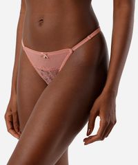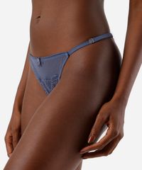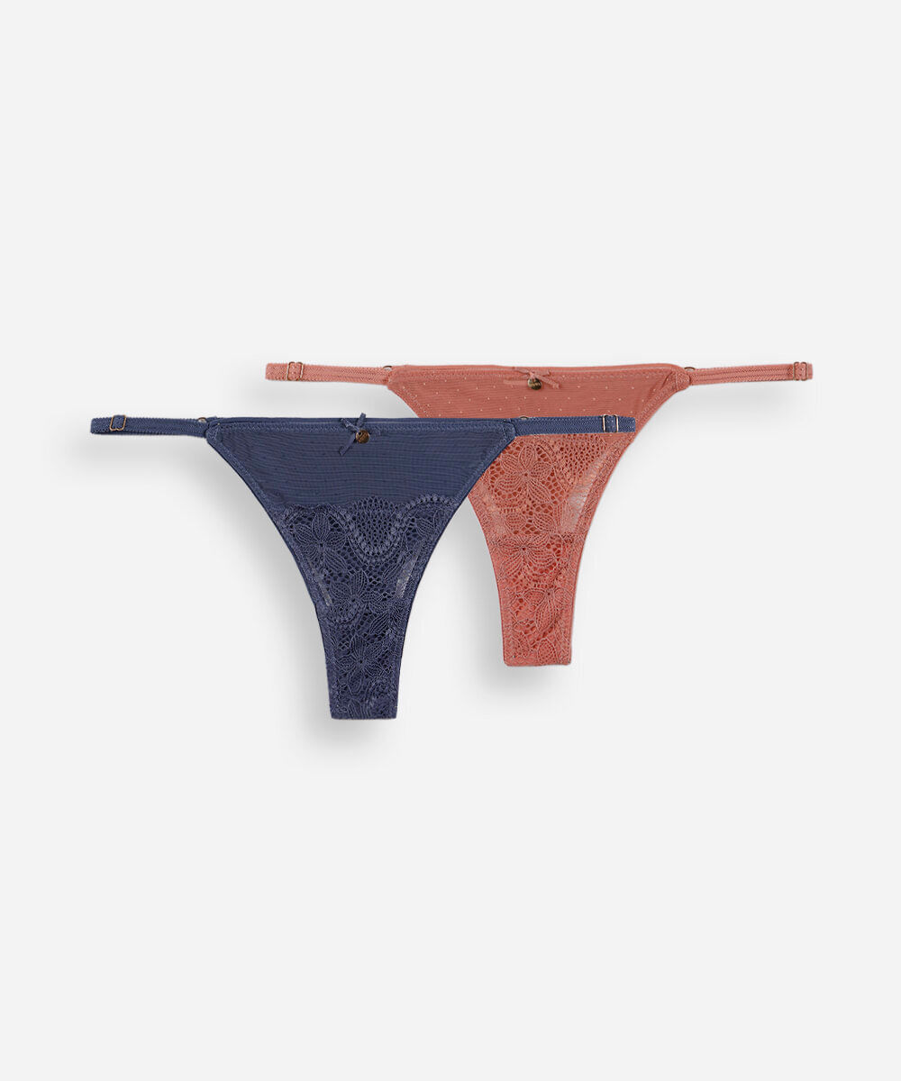 Kit de duas calcinhas confeccionadas em tule com padronagem em poá e renda com padronagem floral. Os modelos são fio dental, cós elástico, caimento ajustado, laterais finas modelo string ajustáveis e menor cobertura posterior. Possuem forro higiênico em malha de algodão. Composição: 90% poliamida, 10% elastano Modelo veste: P/38 Medidas da modelo: Altura: 1,80m Busto 79cm Cintura: 60cm Quadril: 89cm Instruções de lavagem: - Lavagem manual - Não alvejar - Não secar em secadora - Secar na vertical - Não passar - Não lavar à seco