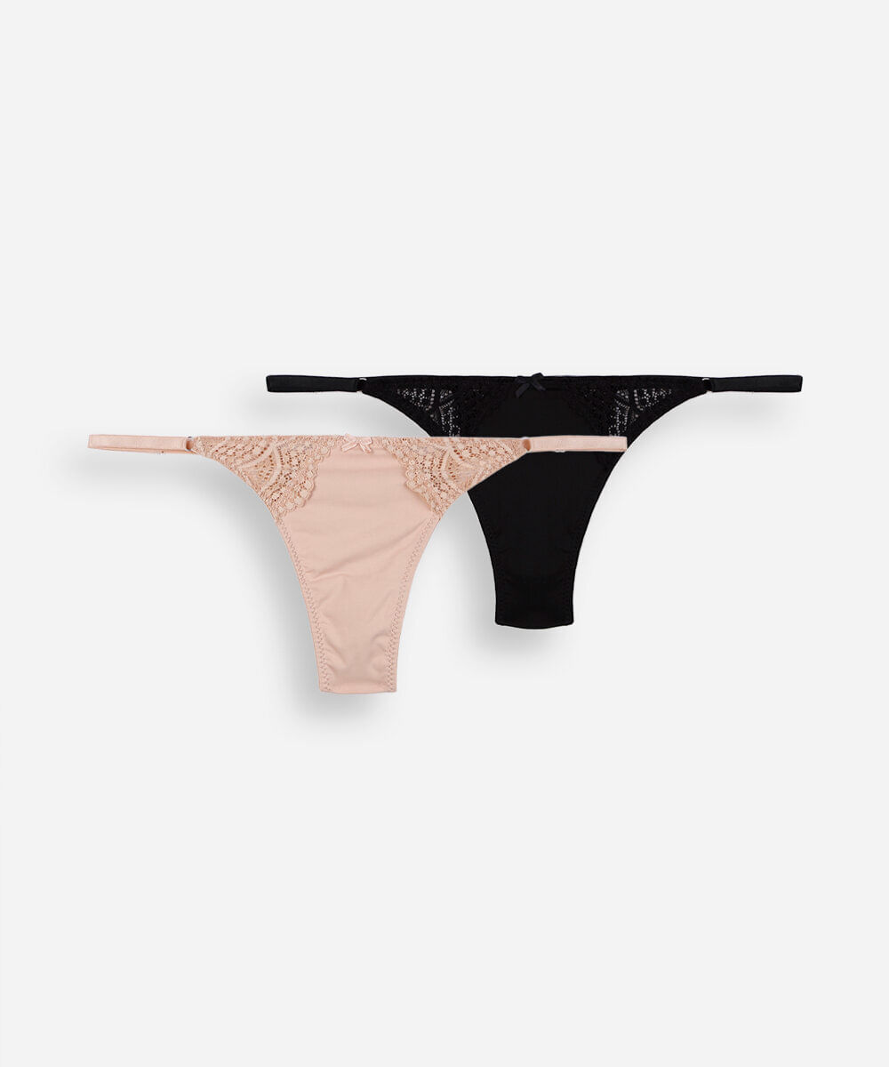 Kit de duas calcinhas feminina confeccionadas em malha de poliamida e renda. Os modelos são string fio dental com caimento ajustado, laterais finas elásticas e ajustáveis e com menor cobertura posterior. Possui forro higiênico em malha de algodão.