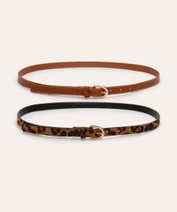 • Contém 2 cintos finos, sendo um preto com acabamento em verniz e um off-white com acabamento fosco.