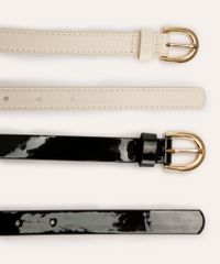 • Contém 2 cintos finos, sendo um preto com acabamento em verniz e um off-white com acabamento fosco.