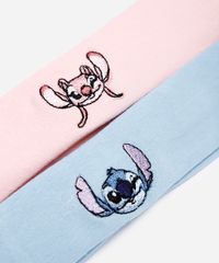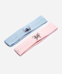 Kit de 2 faixas de cabelo infantis confeccionadas em malha de algodão maleável. Os modelos possuem diferentes cores e estampas bordadas com desenho dos personagens Stitch e Angel da Disney. Ótima escolha para deixar os penteados ainda mais divertidos.