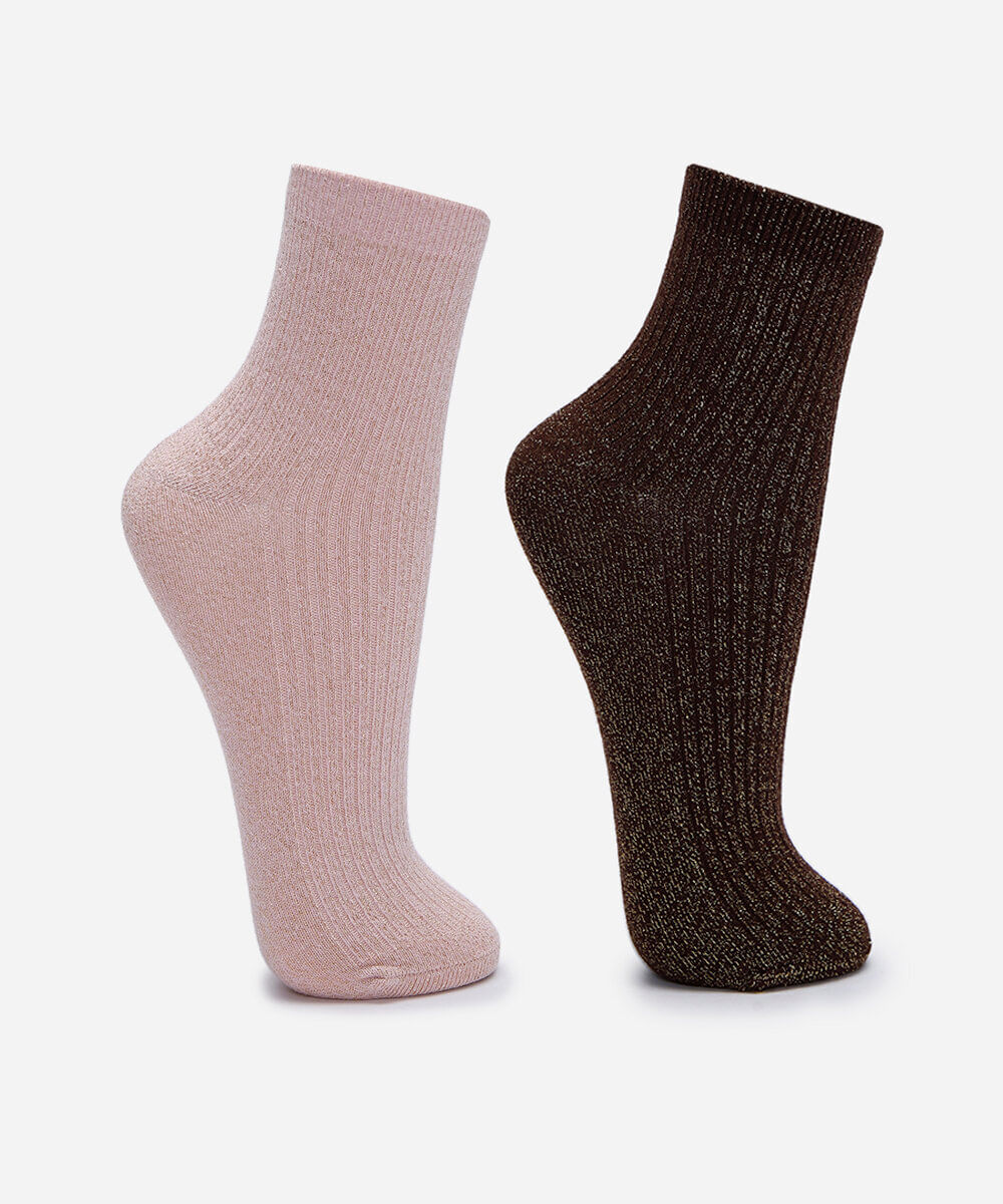 Kit de dois pares de meias confeccionado em malha com algodão e fios de lurex que acrescentam brilhos. Os modelos têm cano alto, caimento ajustado aos pés e acabamento canelado na parte superior.