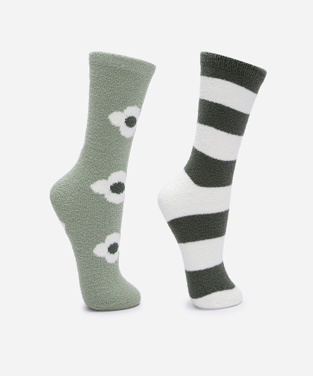 Kit de dois pares de meias confeccionado em malha texturizada com toque macio. Os modelos têm cano alto, estampa floral e listrada, caimento ajustado aos pés e acabamento canelado na parte superior.