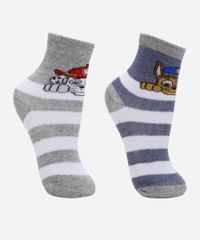 Par de meias confeccionado em malha com algodão e estampa listrada e temática da Patrulha Canina. Os modelos são cano médio com caimento ajustado aos pés e acabamento canelado na parte superior.