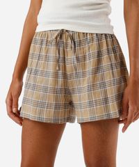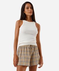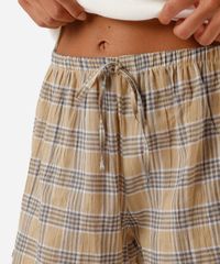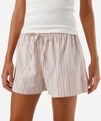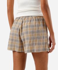 Kit de dois shorts boxer feminino confeccionado em tecido plano de algodão com estampa xadrez e listrado. As peças tem modelagem reta, e caimento solto ao corpo. Possuem cintura média, cós com elástico embutido e cordão. Detalhe de acabamento pespontado nas barras.