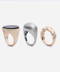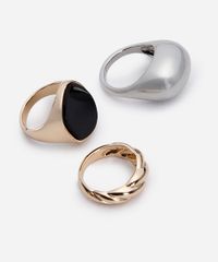 Kit de três anéis desenvolvidos em metal resistente com formas orgânicas. Composto um modelo prateado arredondado, outro modelo com textura canelada em tom dourado e outro com aplicação de resina em tom contrastante. Este é um acessório hipoalérgico livre de níquel.