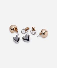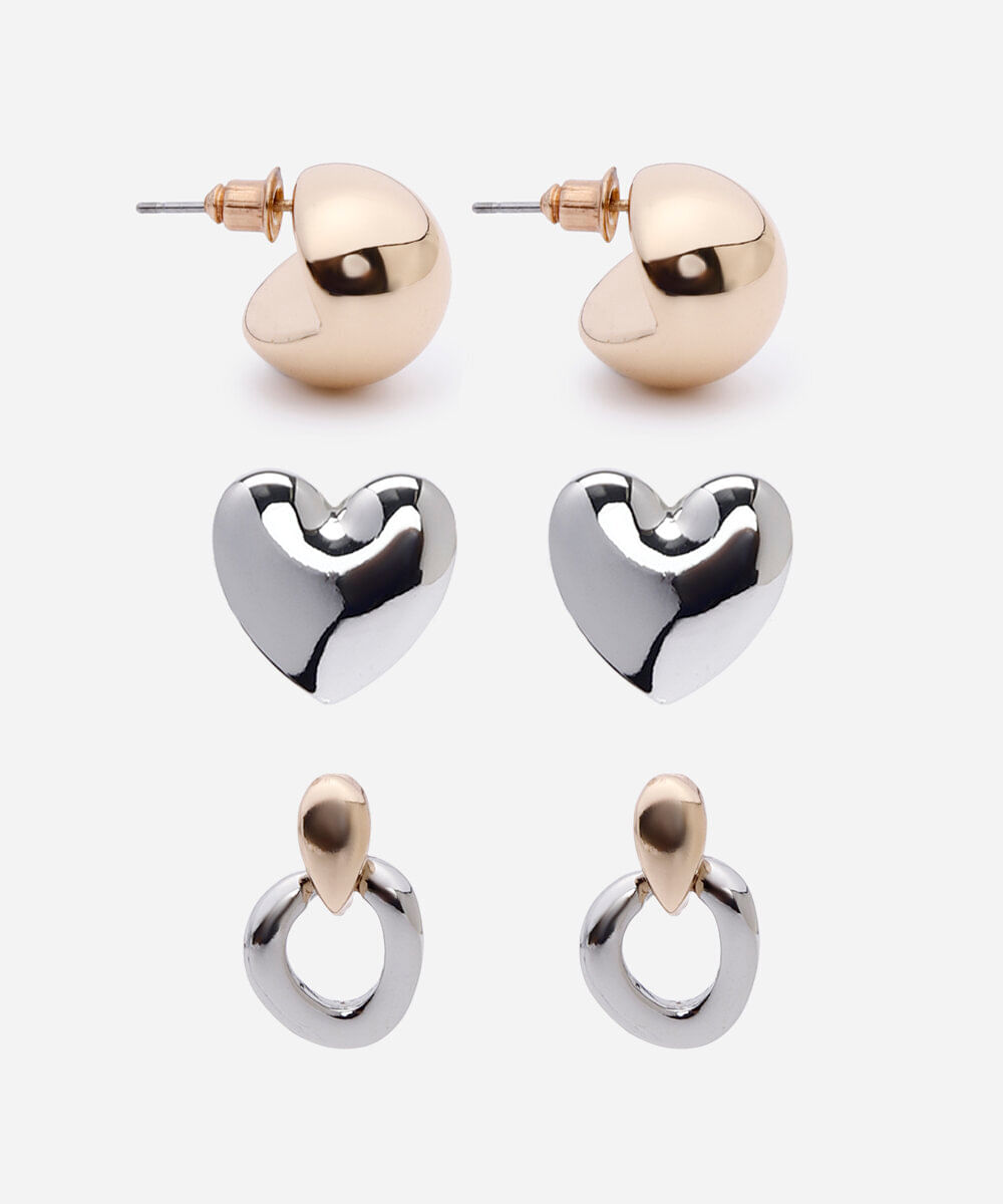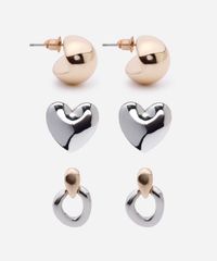 Kit composto por três pares de brincos femininos. Os brincos possuem designs variados, com mix de banho na cor prateada e dourada. O fechamento é seguro e confortável por tarraxa.