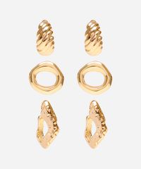 Kit de três pares de brincos confeccionados em metal resistente. Composto por dois modelos argola com texturas orgânica e um modelo redondo. O fechamento é por tarraxa. Este é um acessório hipoalérgico livre de níquel.