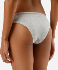 Kit de três calcinhas feminina confeccionadas em malha de viscose. Os modelos são biquíni, com caimento ajustado, laterais médias e maior cobertura posterior. Possui forro higiênico e malha de algodão e cós em renda.