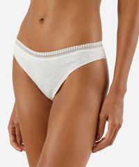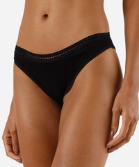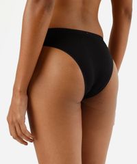 Kit de três calcinhas feminina confeccionadas em malha de viscose. Os modelos são biquíni, com caimento ajustado, laterais médias e maior cobertura posterior. Possui forro higiênico em malha de algodão e cós em renda.