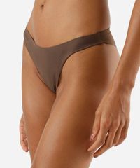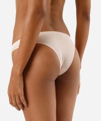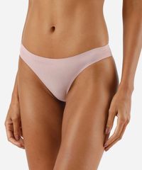 Kit de três calcinhas feminina confeccionadas em malha de poliamida com textura canelada. Os modelos são biquíni, com caimento ajustado, laterais médias e maior cobertura posterior. Possui forro higiênico em malha de algodão e acabamento sem costura.