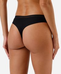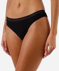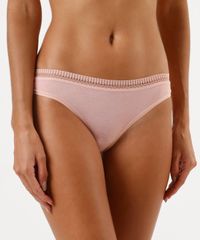 Kit de três calcinhas femininas confeccionadas em malha de viscose. Os modelos são fio dental com caimento ajustado, cós elástico com renda aplicada, laterais médias e acabamento selado. Composição 90% viscose 10% elastano Modelo veste: P/38 Medidas da modelo: Altura: 1,80m Busto 79cm Cintura: 60cm Quadril: 89cm Instruções de lavagem: - Lavagem manual - Não alvejar - Não secar em secadora - Secar na vertical - Não passar - Não lavar à seco