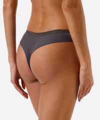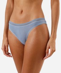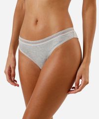 Kit de três calcinhas feminina confeccionadas em malha de viscose com detalhes em renda. Os modelos são fio dental, com caimento ajustado, laterais médias e menor cobertura posterior. Possui forro higiênico em malha de algodão.