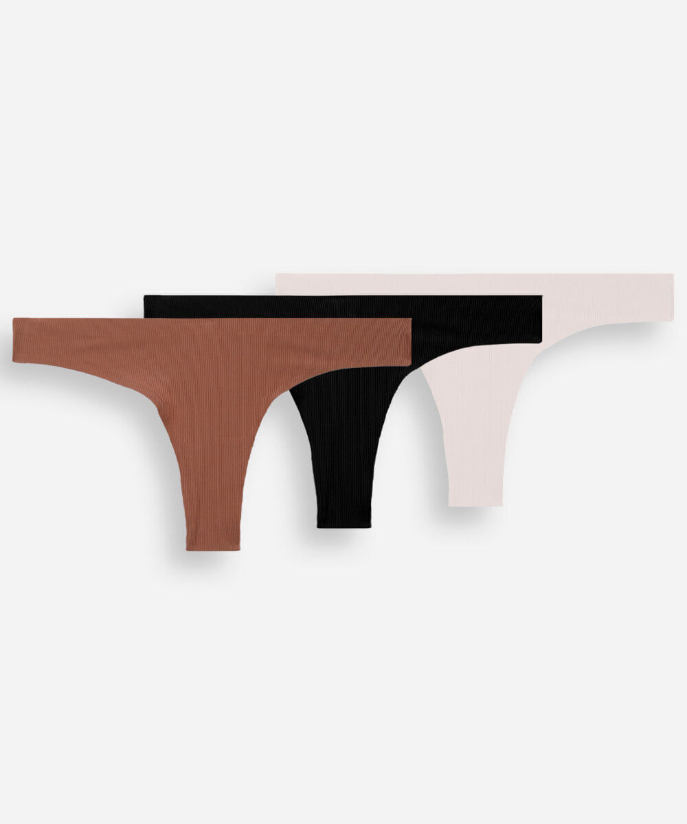 Kit de três calcinhas femininas confeccionadas em malha canelada de poliamida. Os modelo são fio dental, com caimento ajustado, laterais médias e menor cobertura na parte posterior. Possui forro higiênico em malha de algodão e acabamento sem costura.