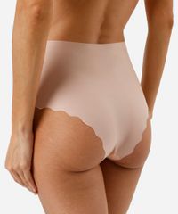 Kit de três calcinhas femininas confeccionadas em malha de poliamida. Os modelos são hot pant, com caimento ajustado, cintura alta, laterais largas e cobertura maior na parte posterior. Detalhe de acabamento sem costura e com forro higiênico em malha de algodão.