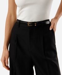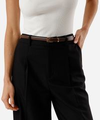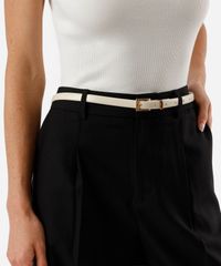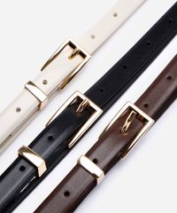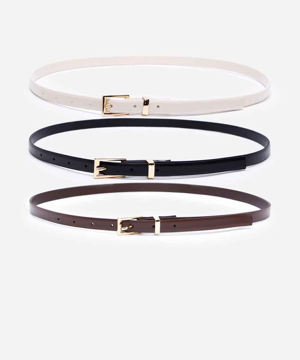 Kit de três cintos desenvolvidos em material sintético resistente. O modelos são finos com passantes fixos e fivelas quadradas com níveis de ajuste.