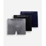 Kit de três cuecas masculinas confeccionadas em malha de poliamida. Os modelos são boxer, com caimento ajustado, comprimento alongado e maior cobertura posterior. O modelo tem cintura média, cós elástico com logo e acabamento sem costura.
