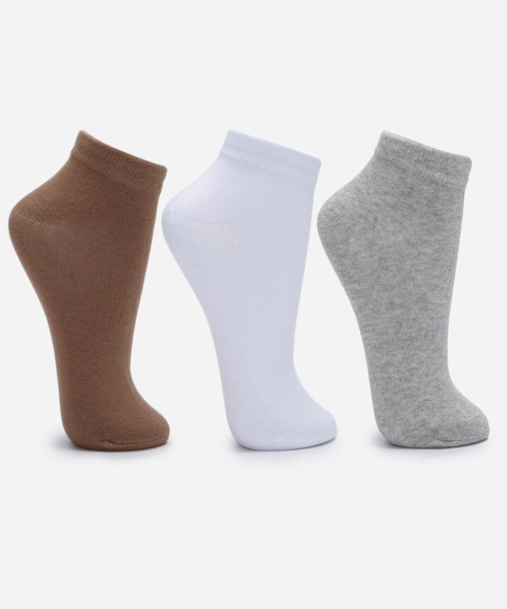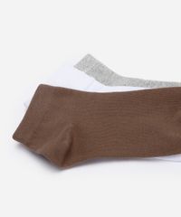 Kit de três pares de meias confeccionado em malha com algodão. Os modelos têm cano baixo, caimento ajustado aos pés e acabamento canelado na parte superior.