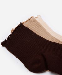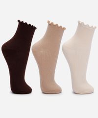 Kit de três pares de meias confeccionado em malha canelada com algodão. Os modelos têm cano alto, caimento ajustado aos pés e acabamento em frufru na parte superior.