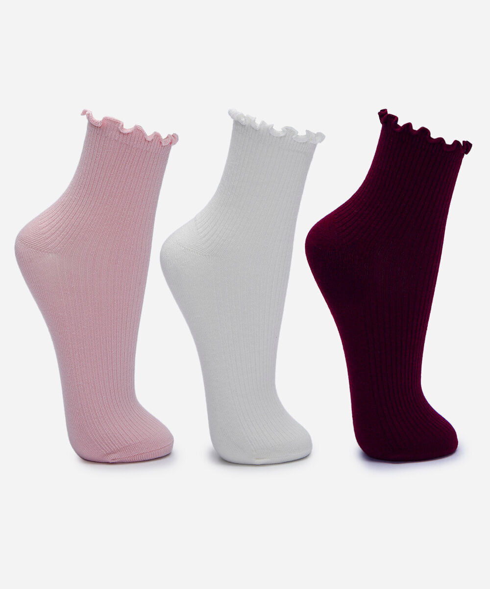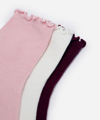 Kit de três pares de meias confeccionado em malha canelada com algodão. Os modelos têm cano alto, caimento ajustado aos pés e acabamento em frufru na parte superior.