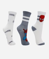 Kit de três pares de meias confeccionado em malha com algodão e estampa temática do Homem-Aranha. Os modelo são cano alto com caimento ajustado aos pés e acabamento canelado na parte superior.