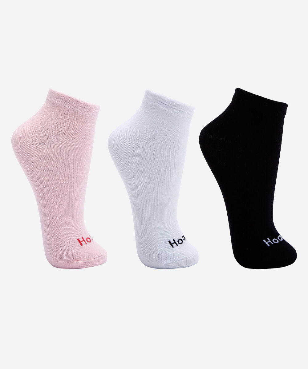 Kit com 3 pares de meias confeccionadas em malha com algodão. Os modelos são cano médio, com caimento ajustado e acabamento canelado na parte superior.