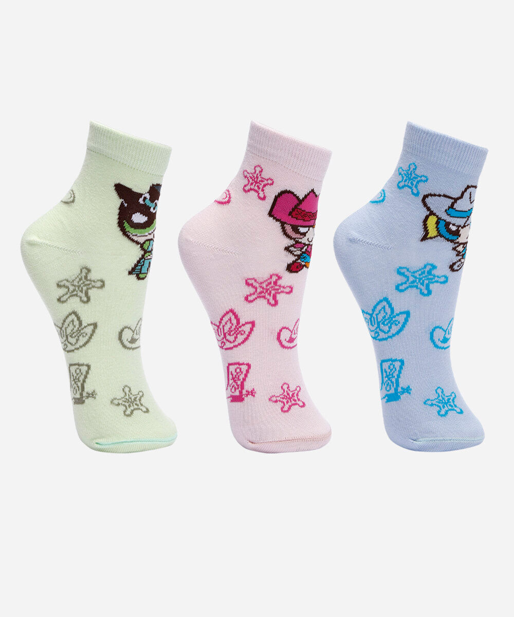 Adicione um toque de diversão e nostalgia aos seus looks com este kit de meias femininas. Inspirado nas Meninas Super Poderosas em uma versão country, cada par é perfeito para expressar sua personalidade de forma descontraída. Confeccionadas em uma malha macia com algodão, estas meias garantem conforto para o dia a dia, seja para ficar em casa ou para compor produções criativas.